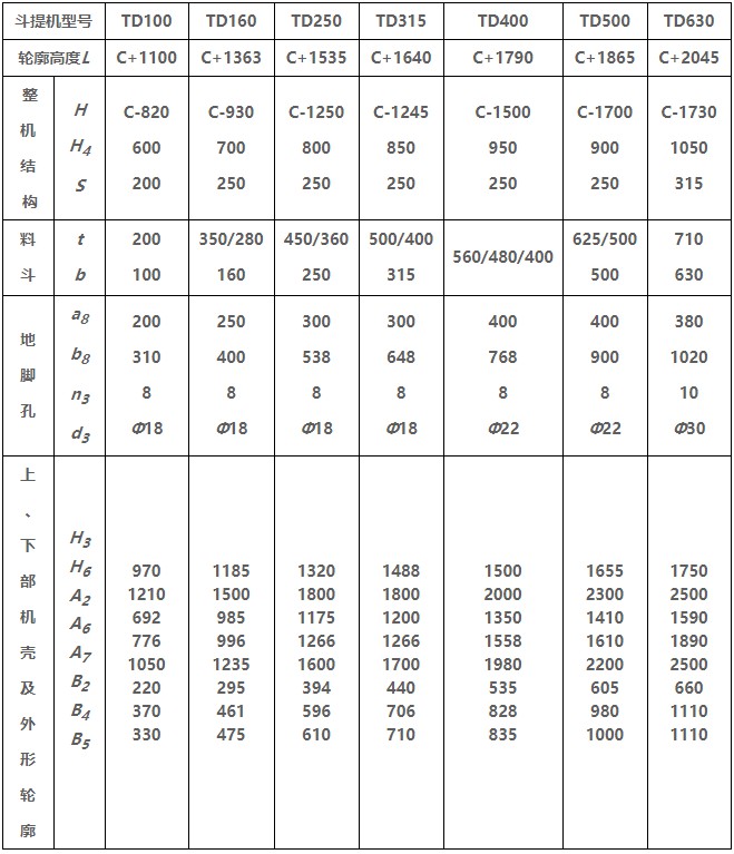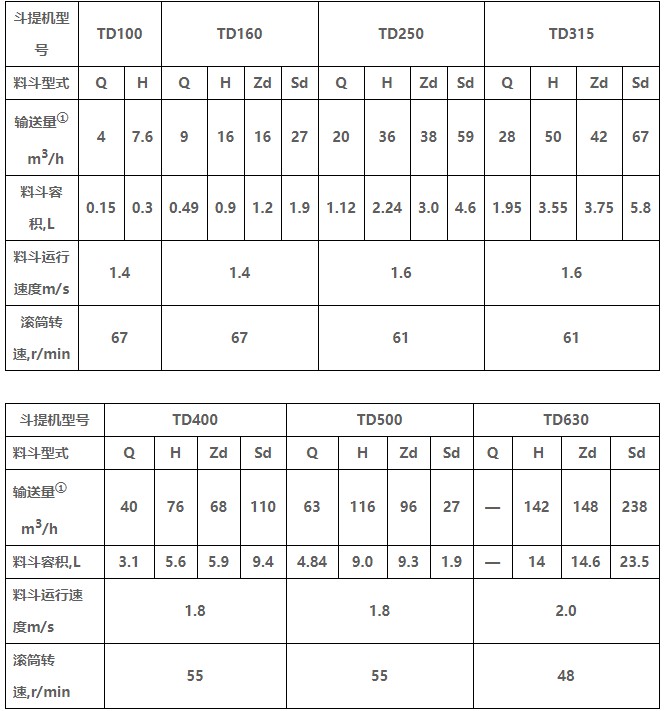 TD型垂直斗式提升機由運行部分(料斗與牽引膠帶)、帶有傳動滾筒的上部區(qū)段、帶有拉緊滾筒的下部區(qū)段、中間機殼、驅(qū)動裝置、逆止制動裝置等組成,適用于向上輸送松散密度ρ<1.5t/m3粉狀、粒狀和小塊狀的無磨琢性和半磨琢性散狀物料,如煤、砂、焦末、水泥、碎礦石等。本機的特點為快速離心卸料:并采用橡膠輸送帶為牽引構(gòu)件,故不適于輸送大塊磨琢性及掏取阻力大的物料。被輸送物料的溫度不得超過60℃,如采用耐熱橡膠帶時溫度不超過200℃。與D型斗式提升機相比,具有輸送效率高,料斗型式多等特點。